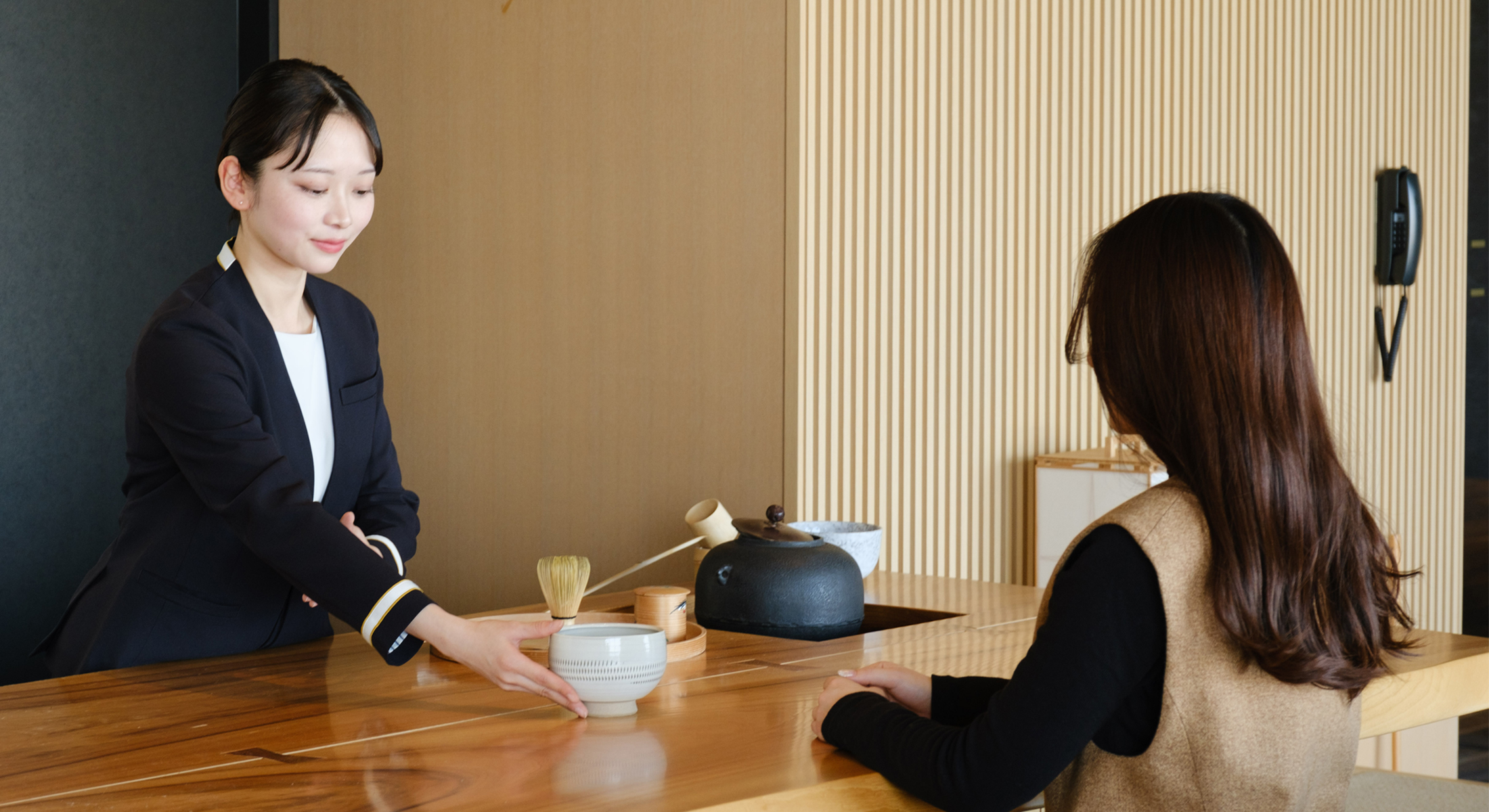 畳をあしらった⼩上がりでは、洗練された和の空間で抹茶や挽きたてコーヒーをお楽しみいただけます。