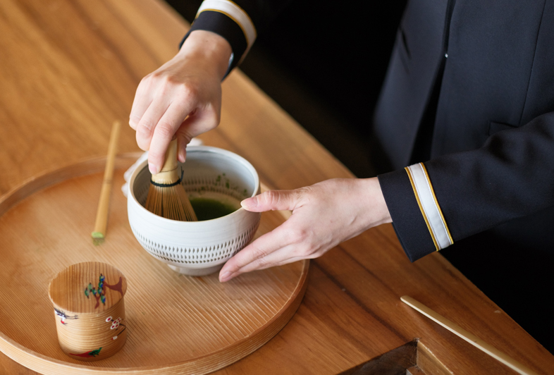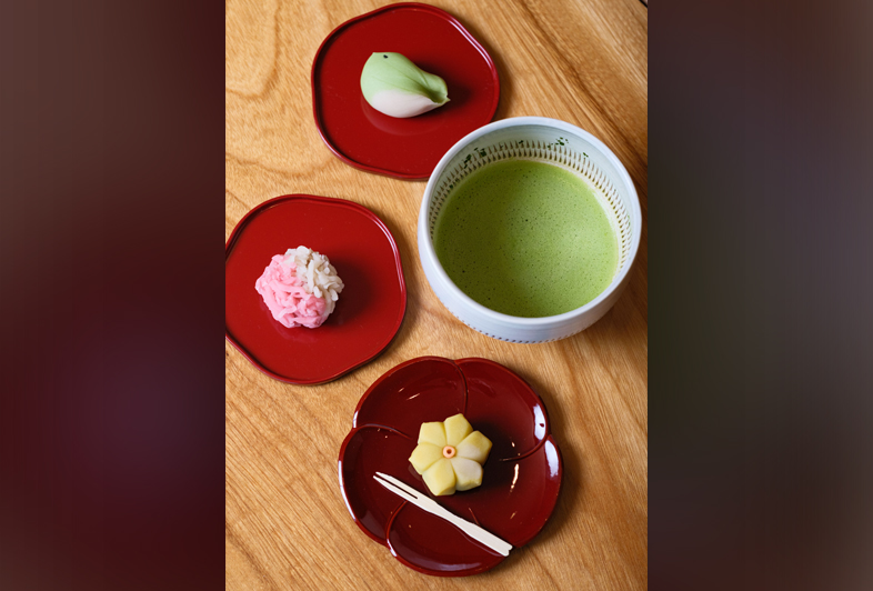 福岡⼋⼥の抹茶とともに四季折々の和菓⼦をお楽しみいただけます。