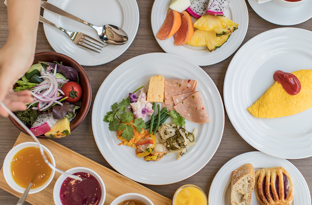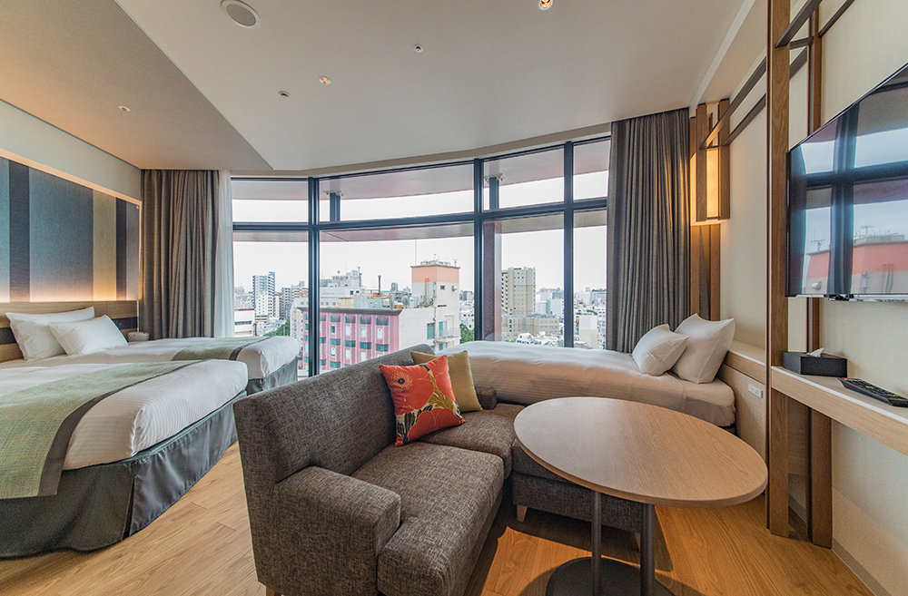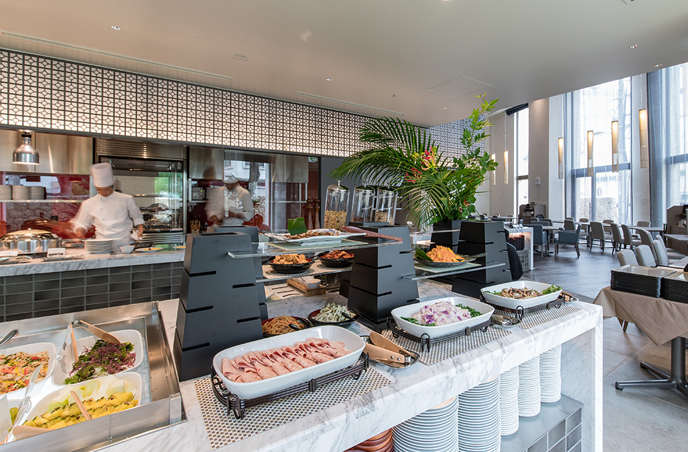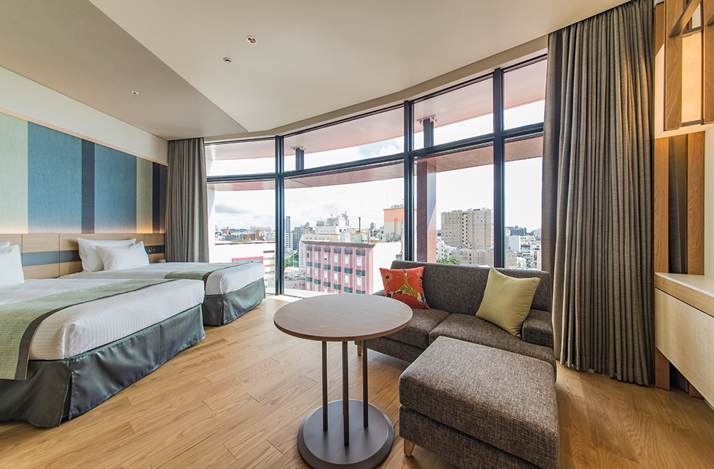 ブルーを基調とした解放感あふれる内装と、こだわりの朝食、那覇では珍しいライブラリーラウンジ等、 JR九州ホテル ブラッサム那覇の魅力を各カテゴリごとの写真でお伝えします。