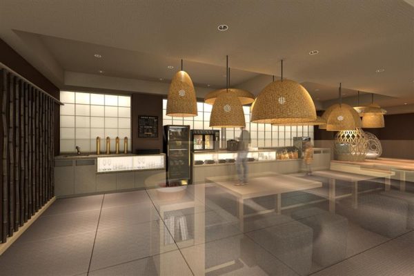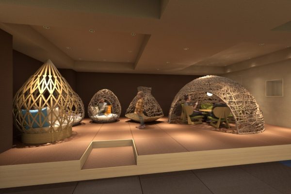 The new all-inclusive lounge "Ippuku" on the second floor will offer tea, coffee, alcoholic and non-alcoholic drinks, as well as snacks to enjoy with your drinks. The lounge space has table seating for multiple people, as well as a sofa space with a large bamboo basket motif in the back, a kids' space, and a library, allowing guests to spend their time comfortably at their own pace, whether reading or chatting.