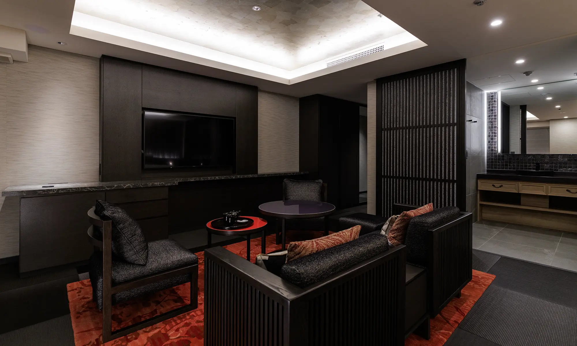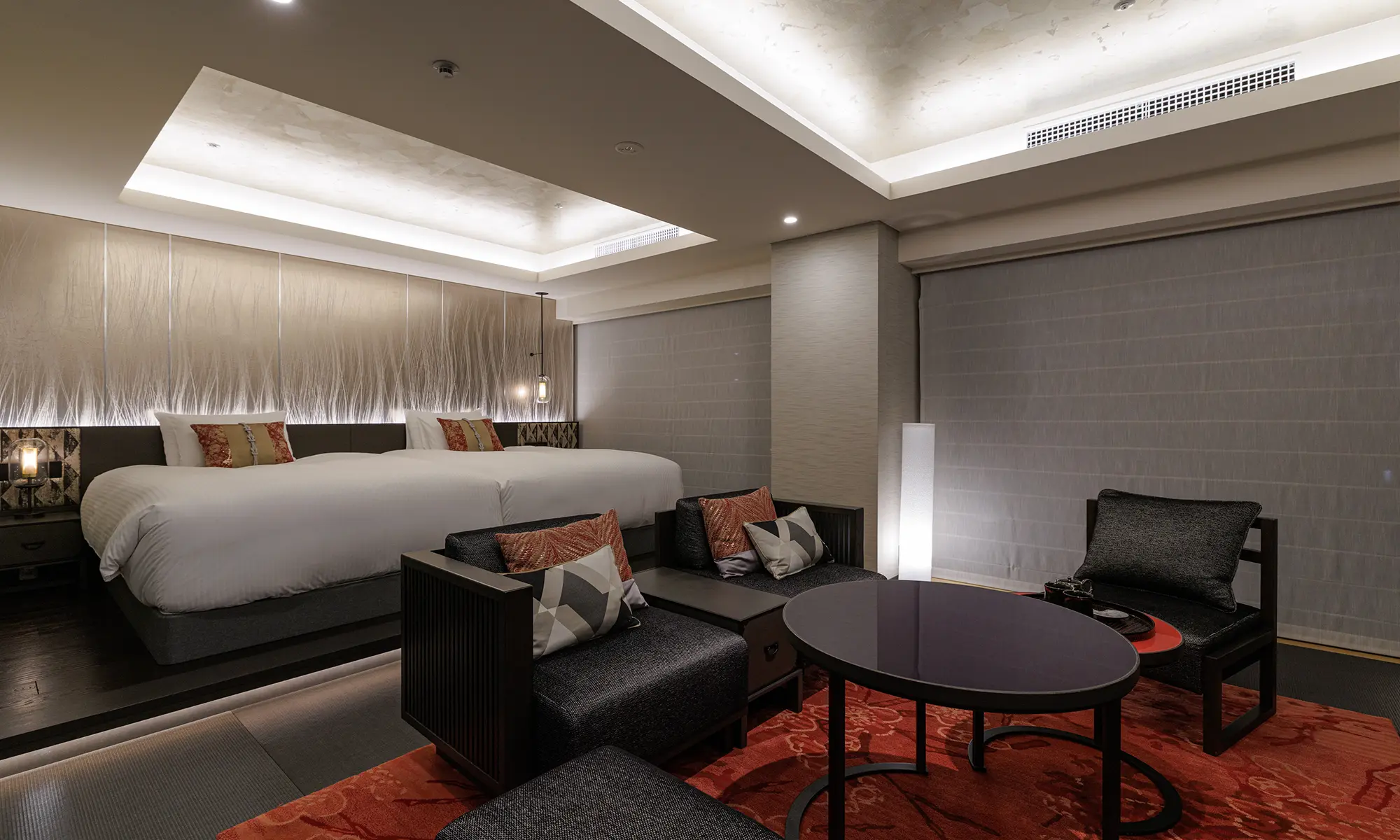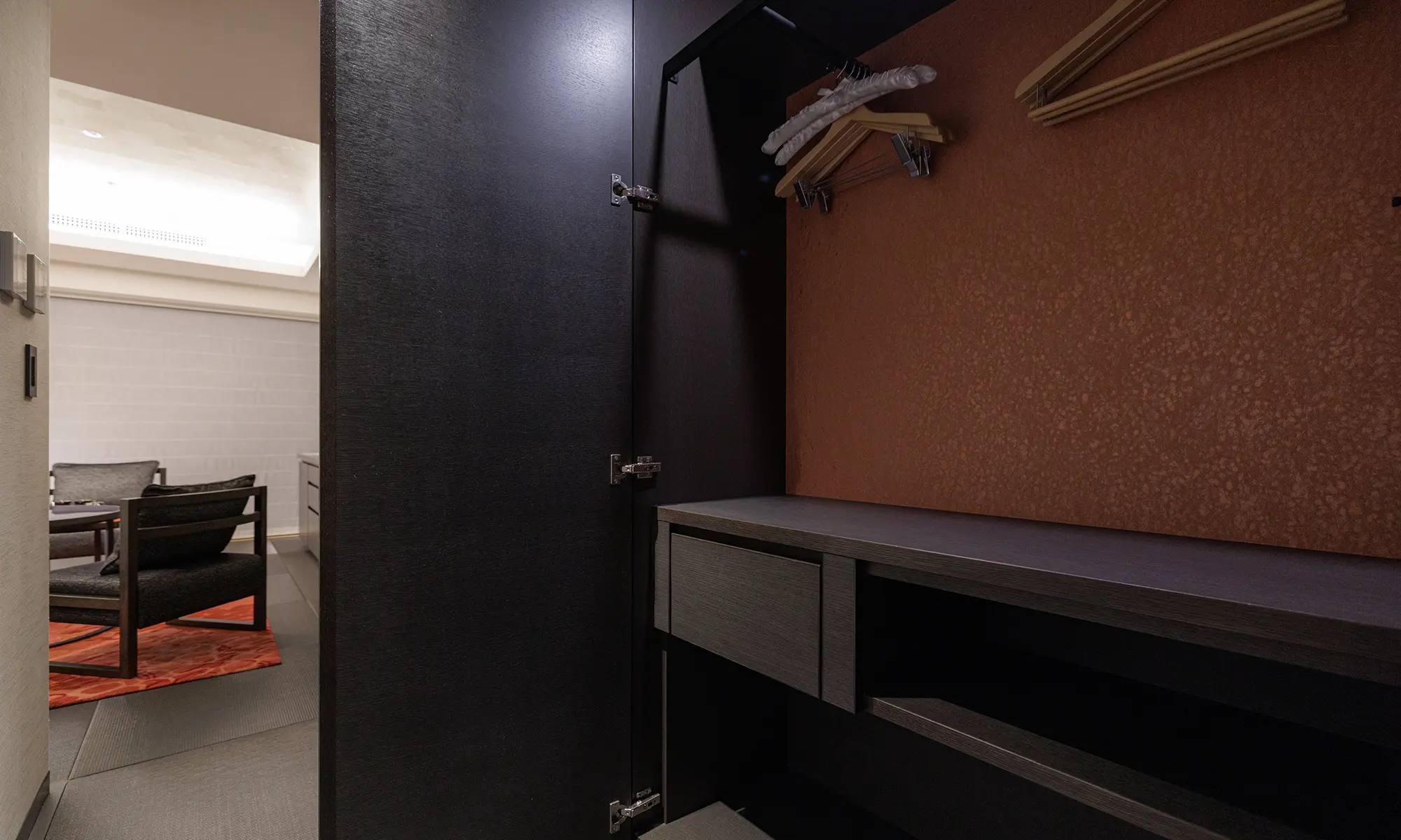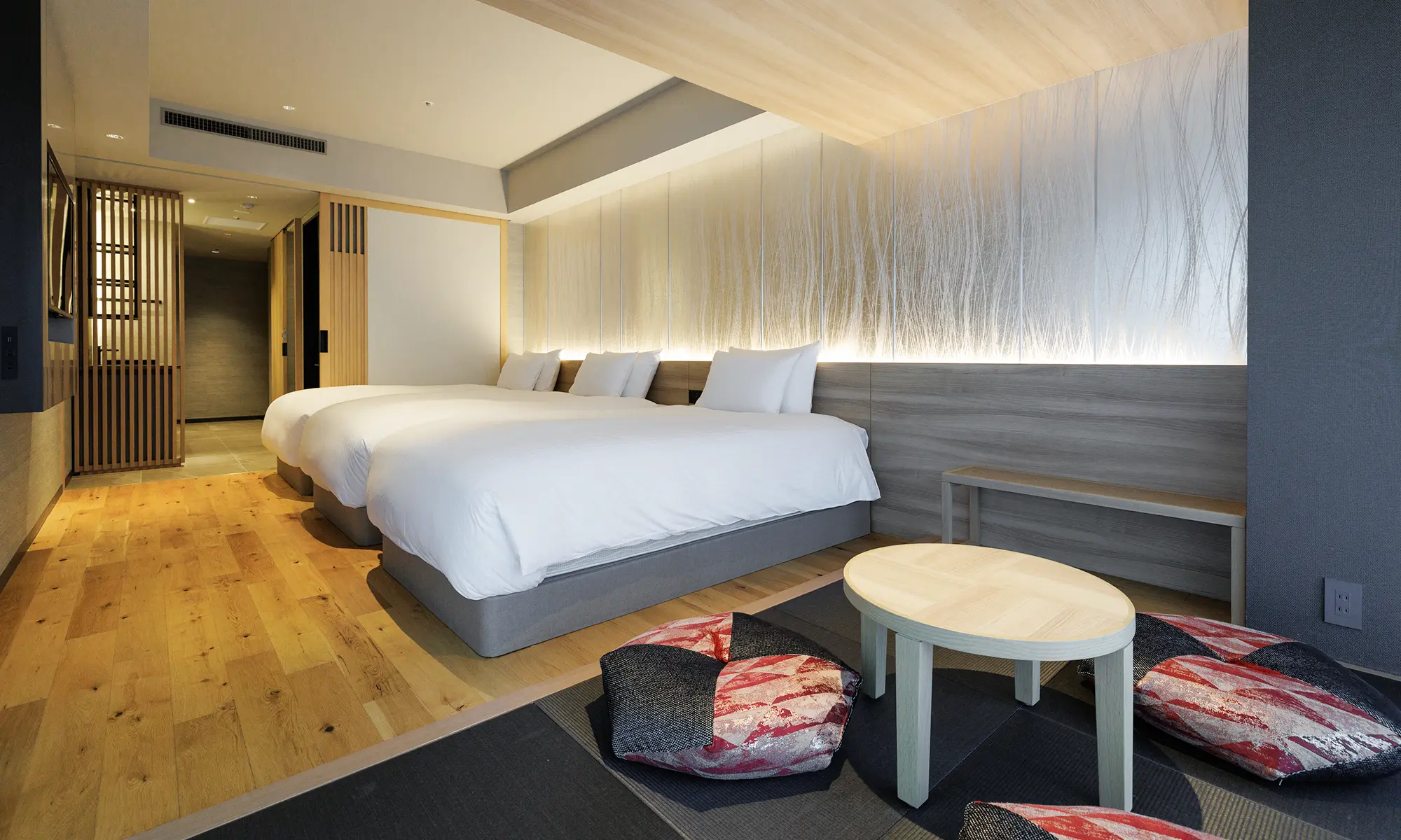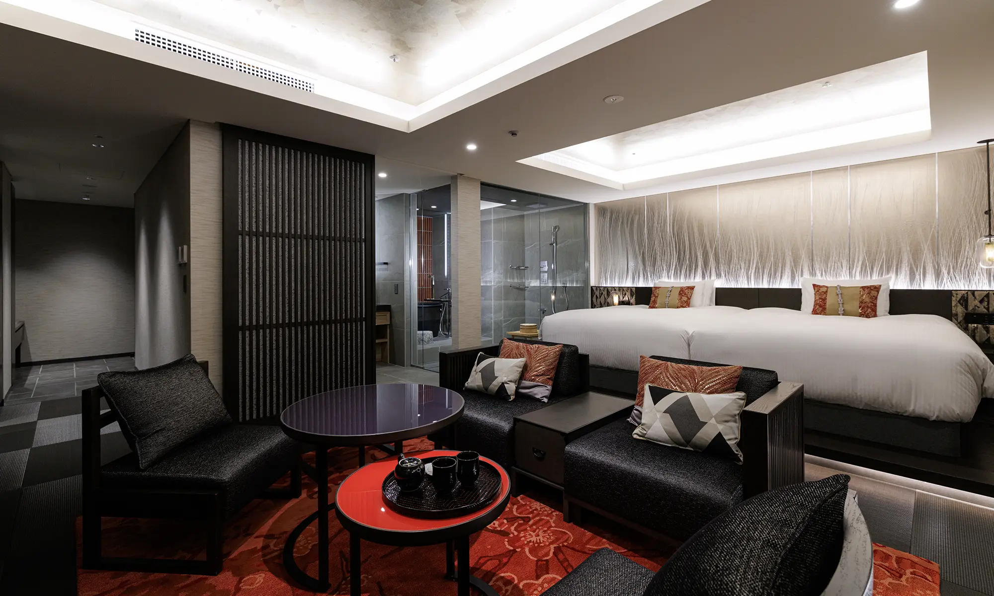 55m2的宽敞房间,常设4张标准床。在房间里面的榻榻米空间,为大家准备了可以放松的京都煎茶。另外,有两处宽敞的洗漱空间,出门的早晨也可以悠闲地准备。最适合家庭或团体住宿。