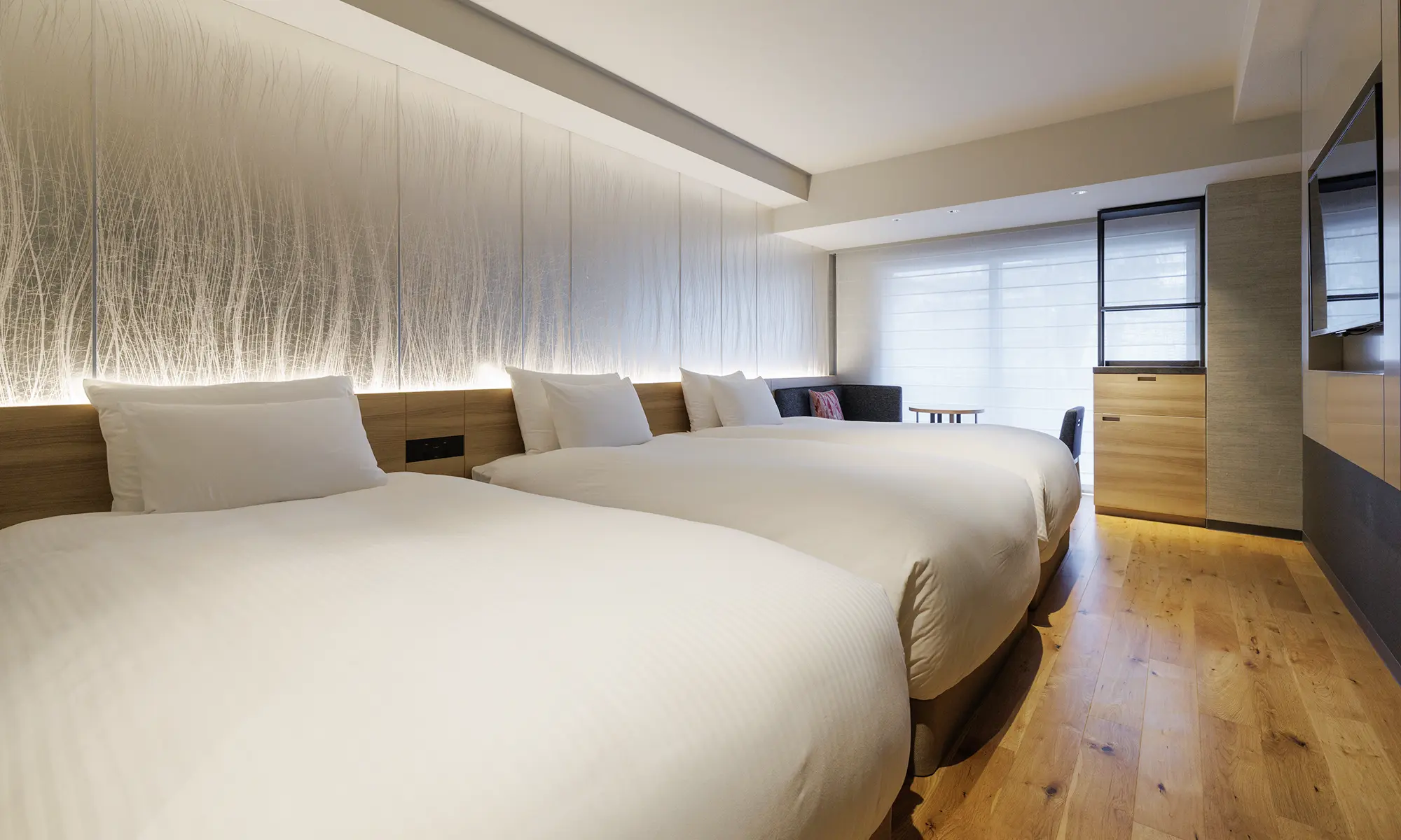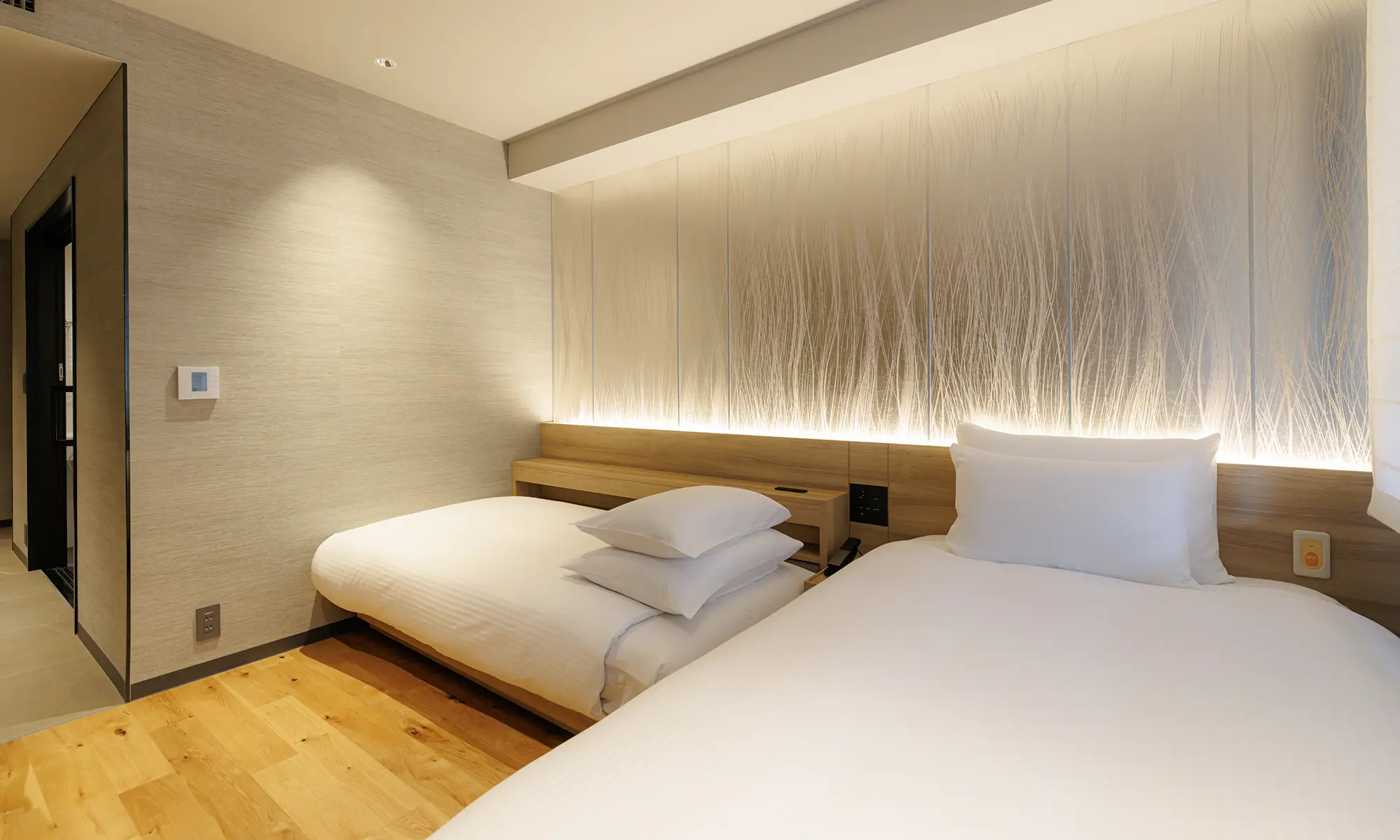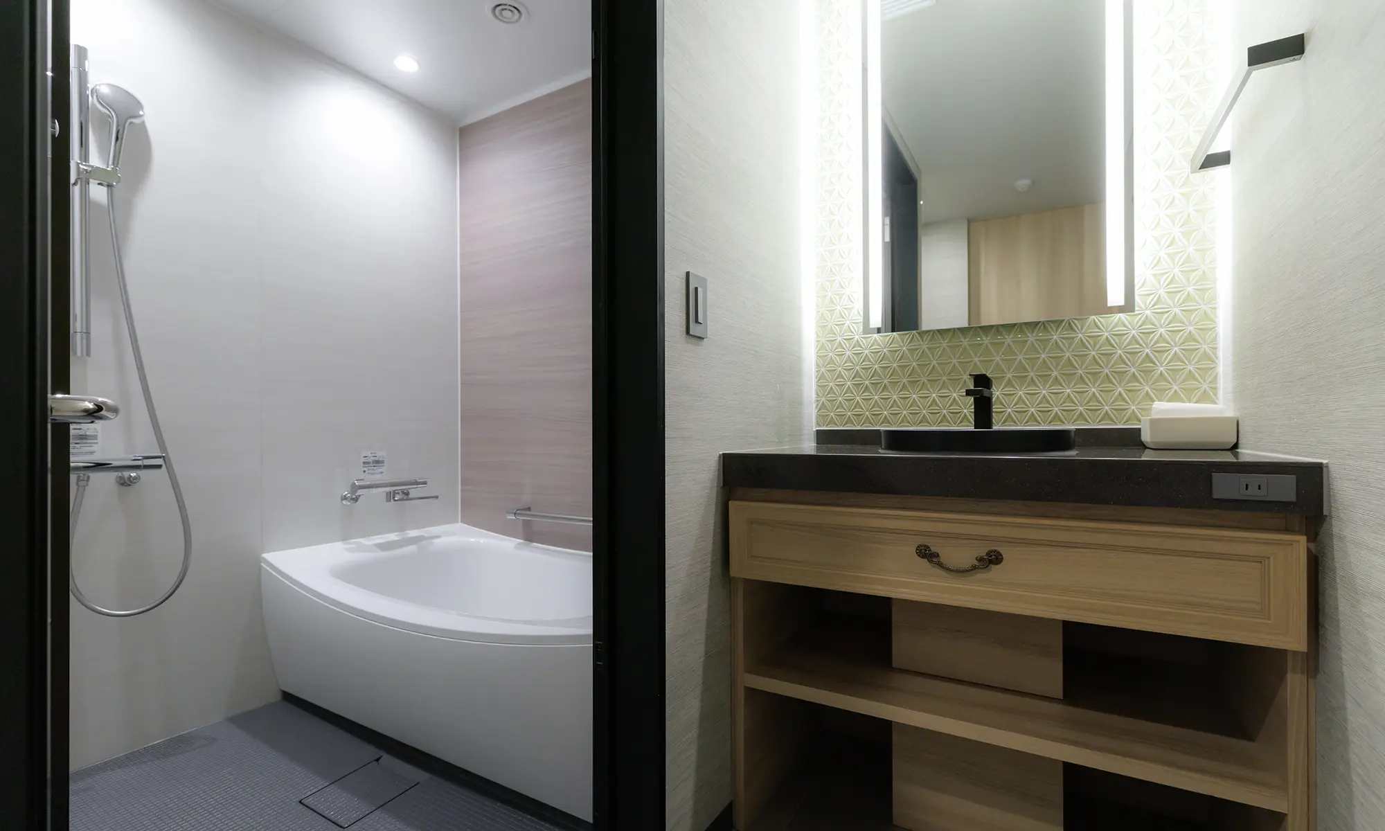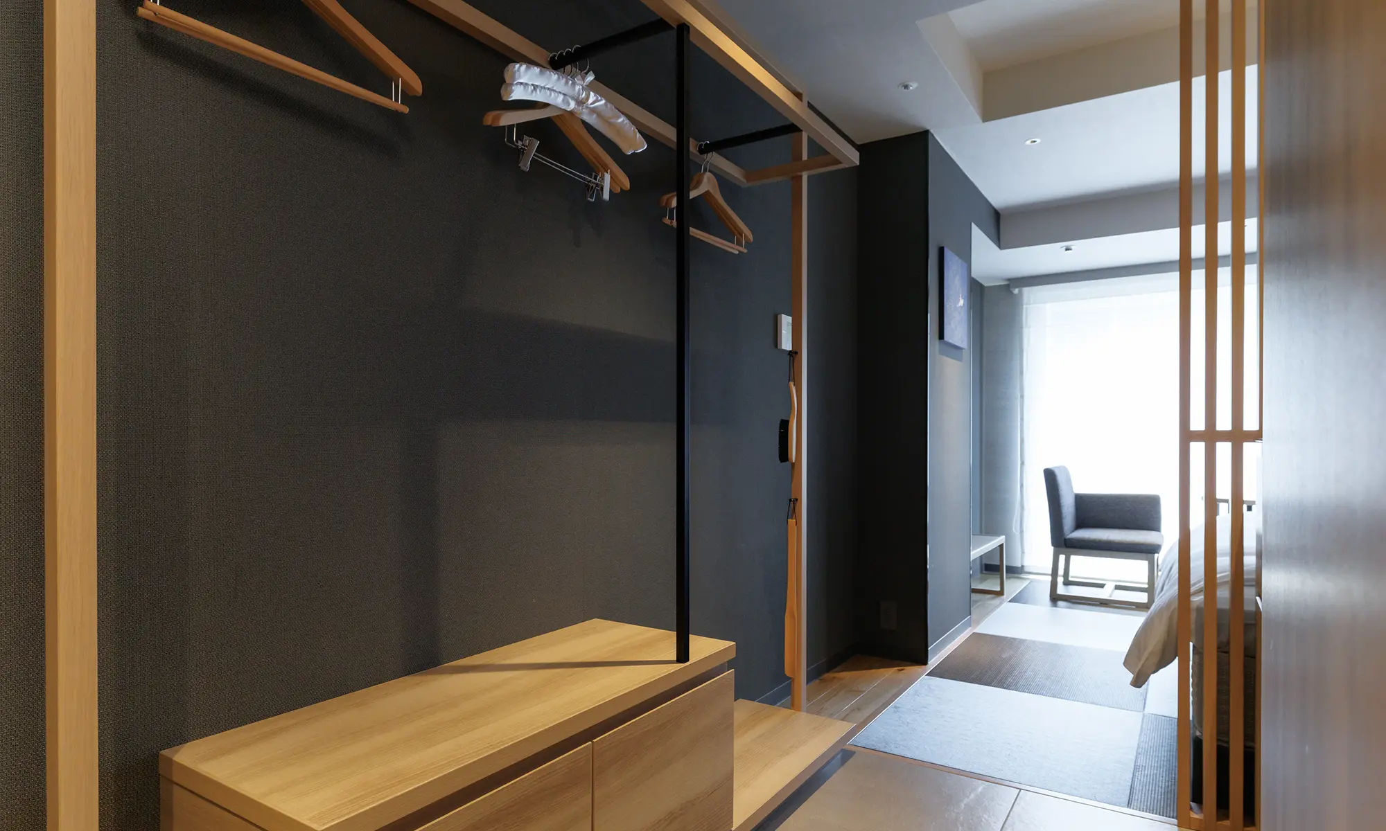55m2的宽敞房间,常设4张标准床。在房间里面的榻榻米空间,为大家准备了可以放松的京都煎茶。另外,有两处宽敞的洗漱空间,出门的早晨也可以悠闲地准备。最适合家庭或团体住宿。