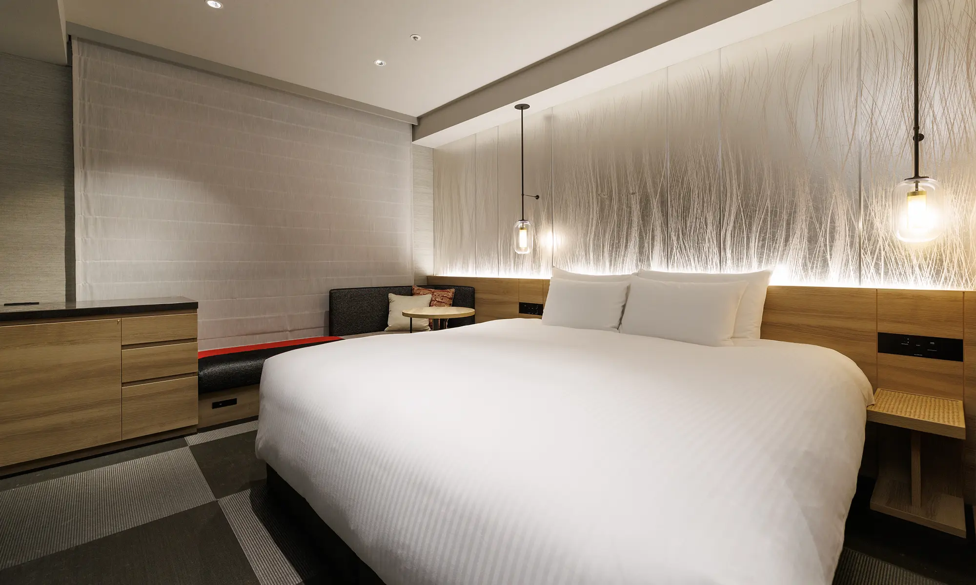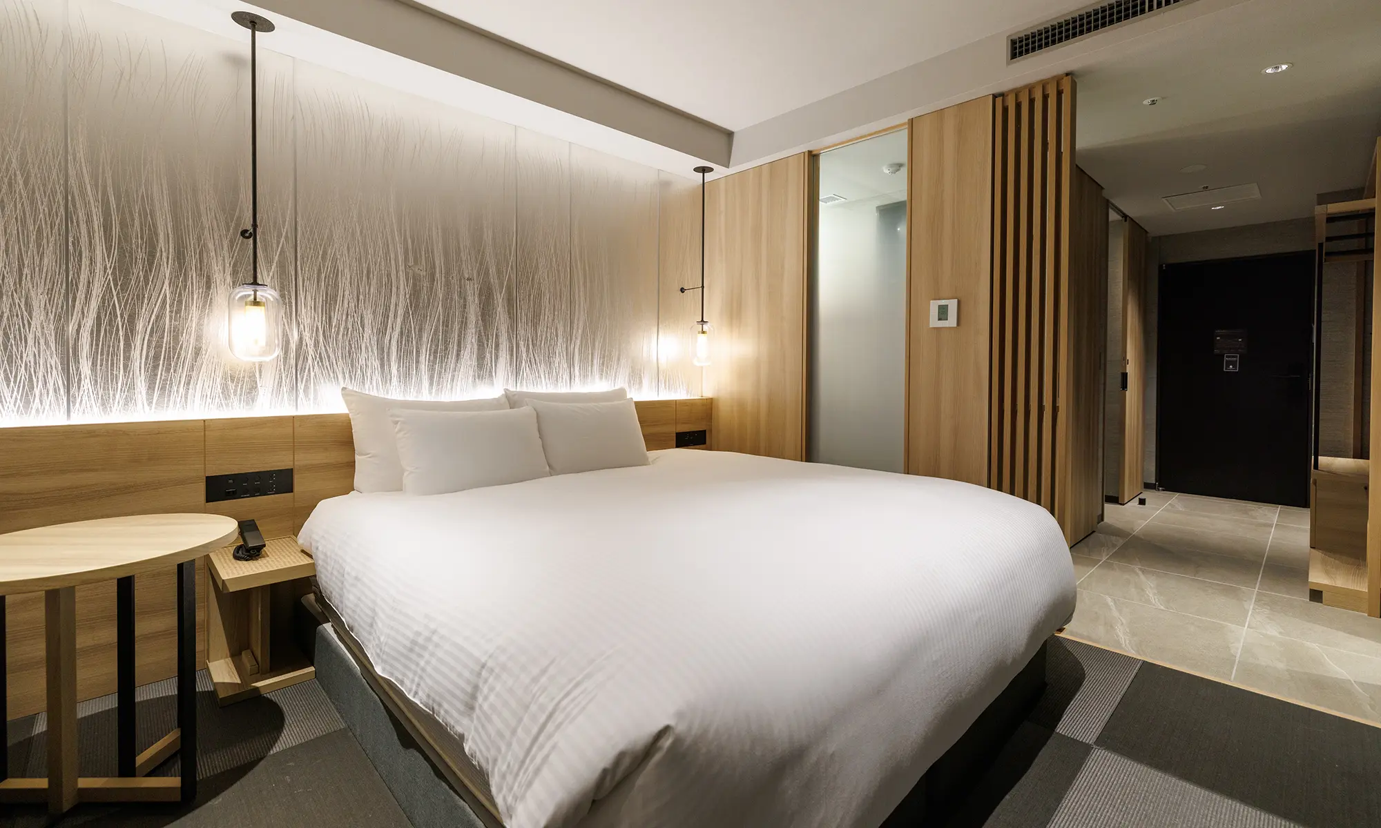 房间是可以脱鞋悠闲度过的榻榻米。备有独立型淋浴房和160cm宽的大号床。